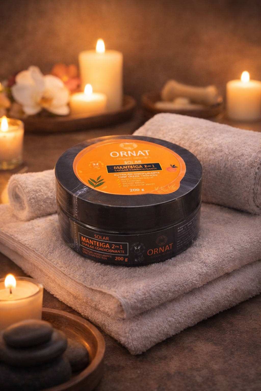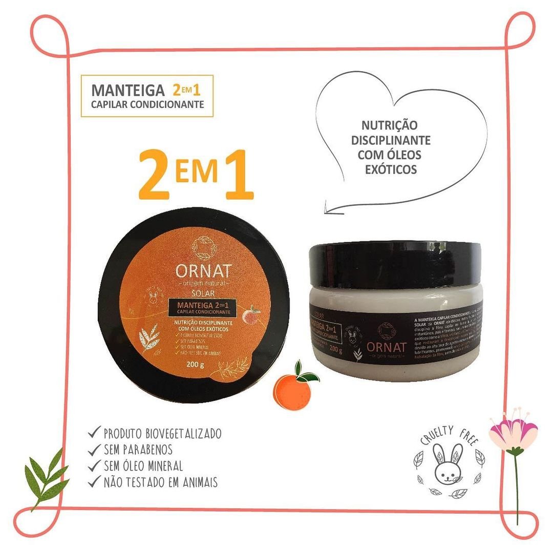 A Manteiga Capilar Condicionante 2 em 1 da Linha Solar da ORNAT tem a função tanto de máscara como condicionador, por isso ela nutre, condiciona, hidrata e realinha as cutículas capilares. Formado por uma blend de óleos exóticos como a Mirra, o Cálamo, a Oliva e a Canela, que restauram a flexibilidade natural dos fios, promovendo a redução do volume, a hidratação da fibra e a redução do frizz. PRINCIPAIS ATIVOS Mirra, Cálamo, Oliva e Canela. (pH 3,5 a 4,0) BENEFÍCIOS Hidrata, nutre e condiciona Nutrição disciplinante com óleos exóticos Redução do volume Controle do frizz Devolve a maciez e emoliência aos fios PROPRIEDADES Sem óleo mineral Sem parabenos Sem silicone Ativos 100% naturais