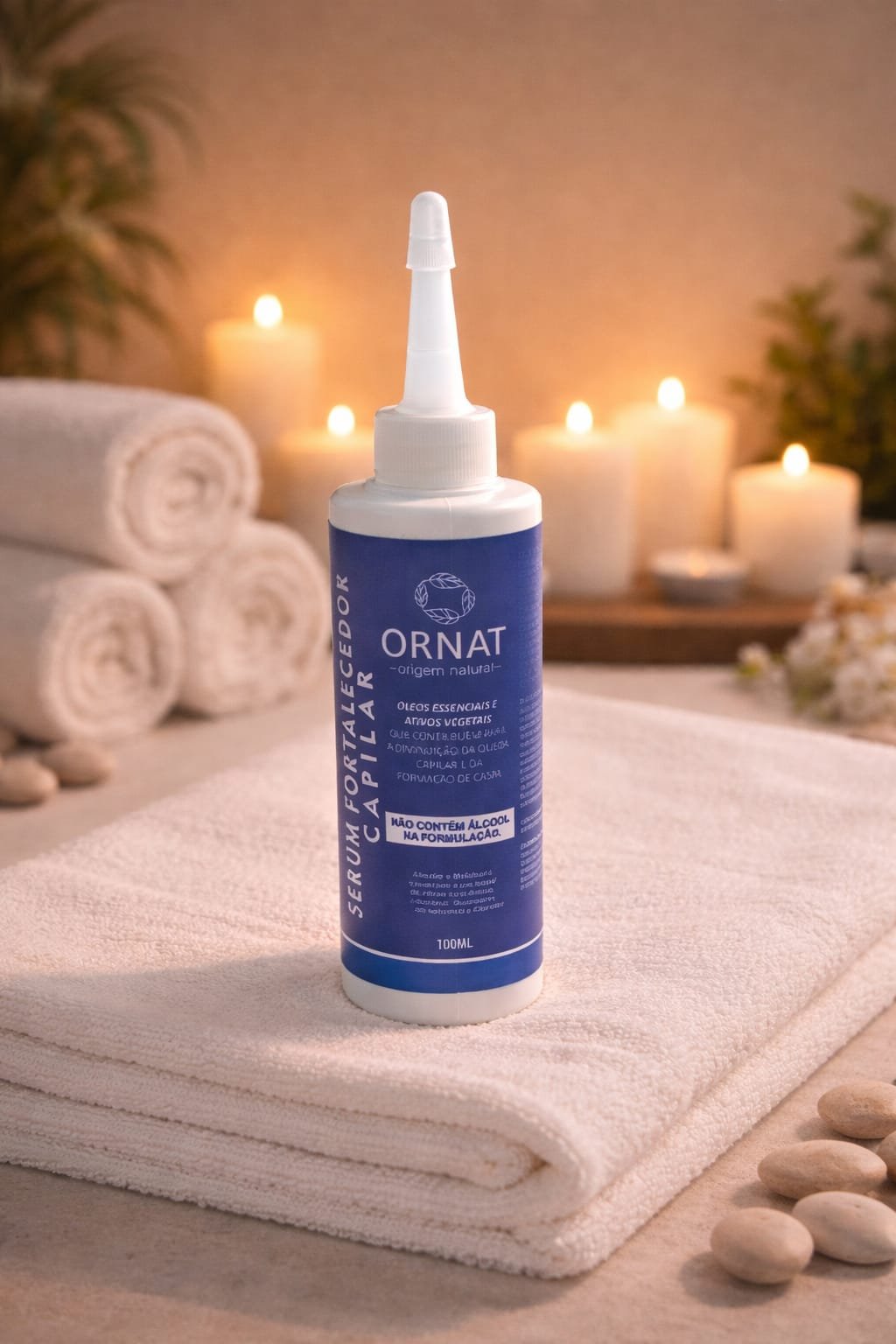 O Sérum Fortalecedor Capilar Ornat foi desenvolvido para auxiliar no cuidado do couro cabeludo e dos fios, com uma fórmula composta por óleos essenciais e ativos vegetais que contribuem para a diminuição da queda capilar e da formação de caspa. Sua composição é sem álcool, oferecendo uma aplicação suave e refrescante no uso diário.