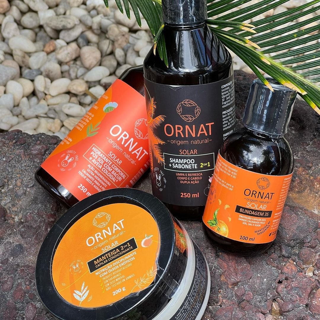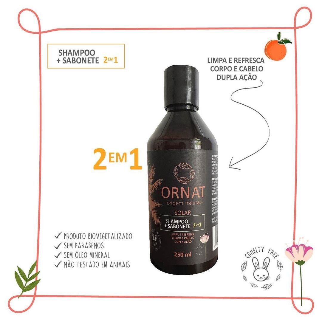 O Shampoo + Sabonete 2 em 1 250ml Solar da ORNAT limpa e refresca o cabelo e o corpo, podendo ser usado somente como shampoo ou como produto único no banho para cabelos e corpo. Livre de sulfatos, sal e parabenos.
